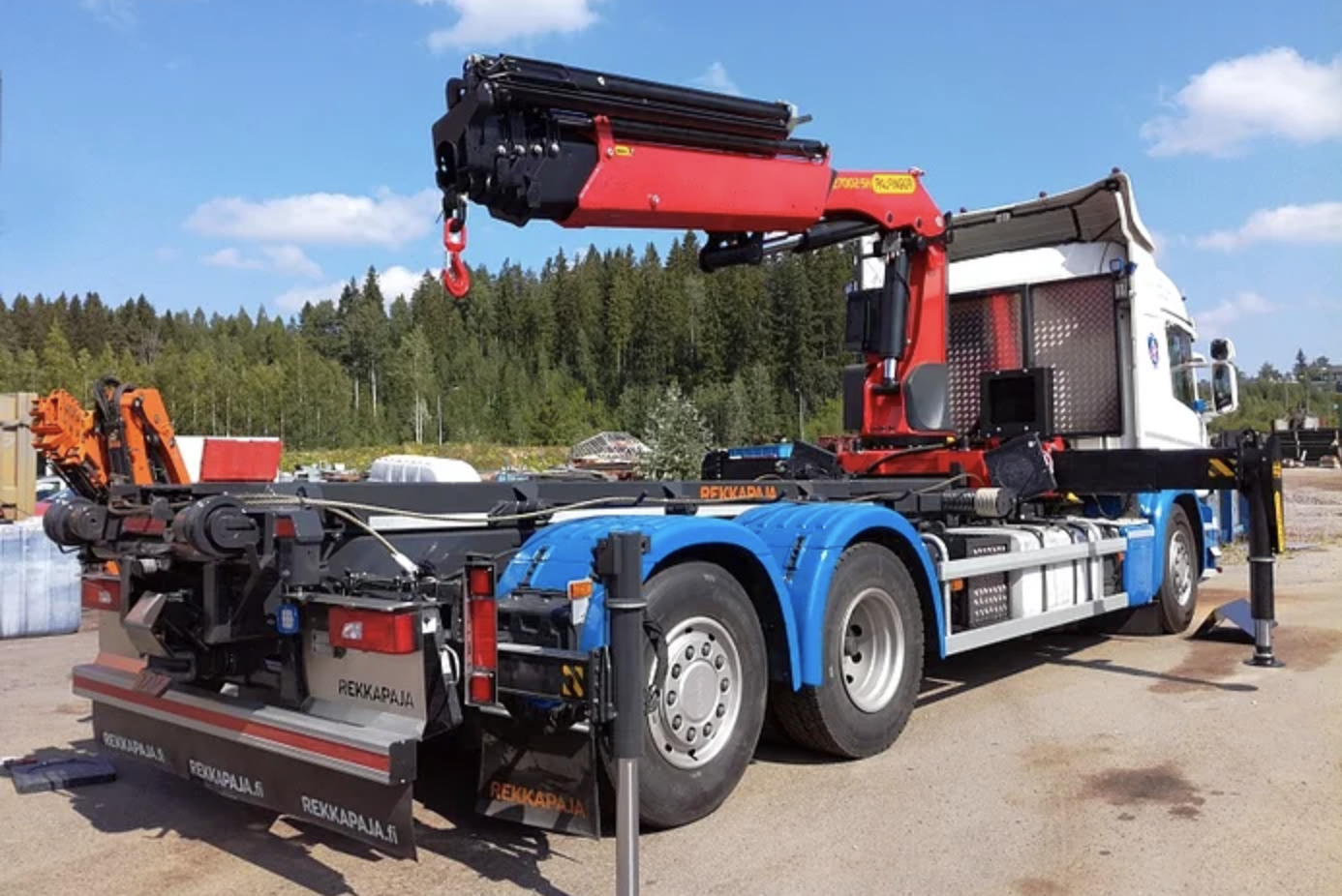 Tanskasta tuotuun Volvo FM 300 4×2 autoon asennettu Palfingerin upea muuttuvakorkeuksisella puomilla oleva koukkulaite